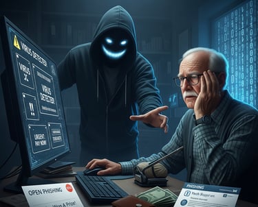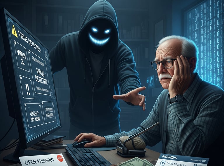 Phishing – Fake emails/calls tricking them into sharing passwords or payments.